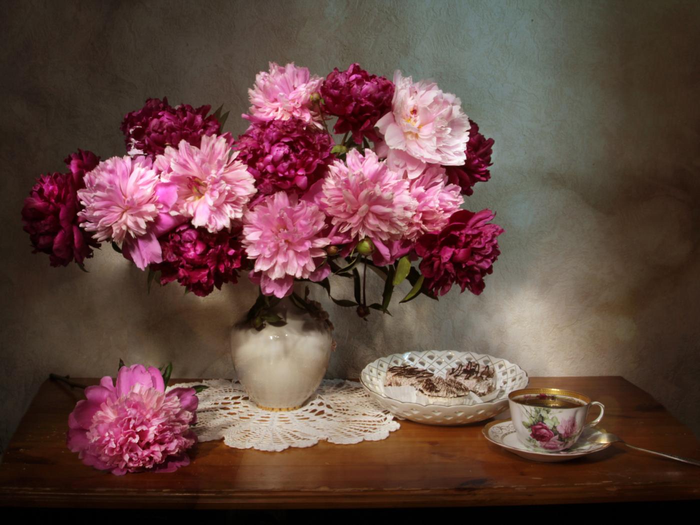 Wallpaper A large bouquet of pink peonies in a vase on the table