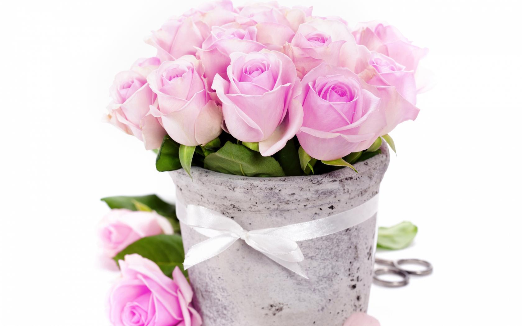 Wallpaper Bouquet of pink roses in a vase with a white ribbon