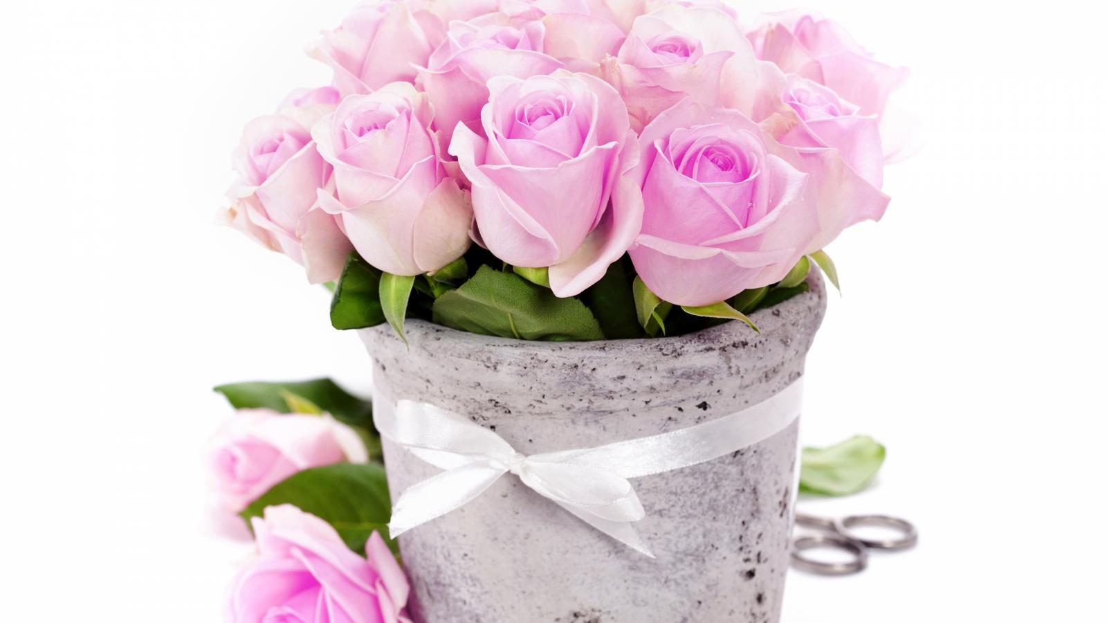 Wallpaper Bouquet of pink roses in a vase with a white ribbon