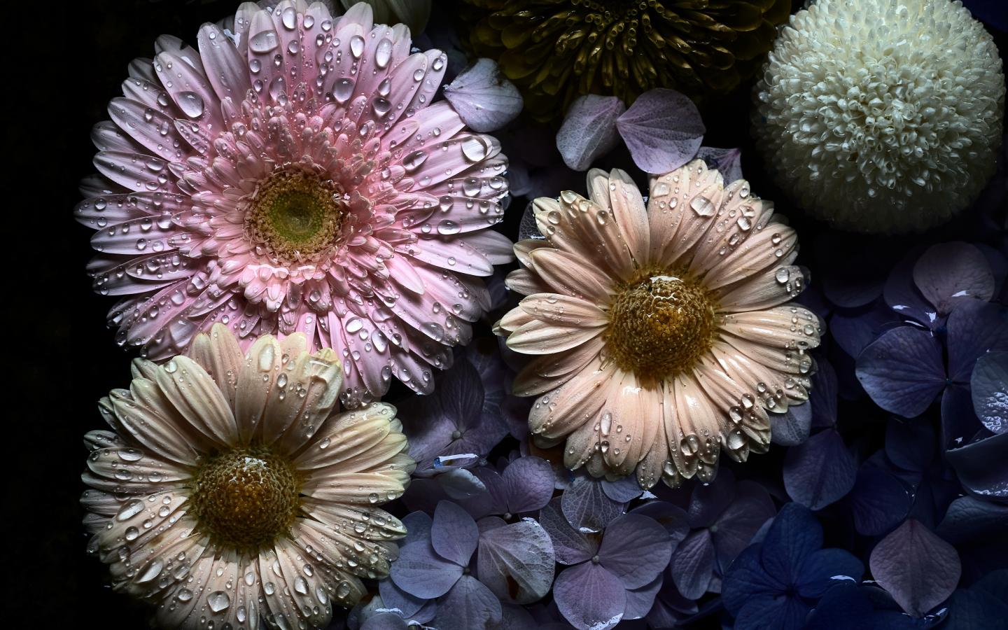 Wallpaper Gerbera and hydrangea flowers in water drops