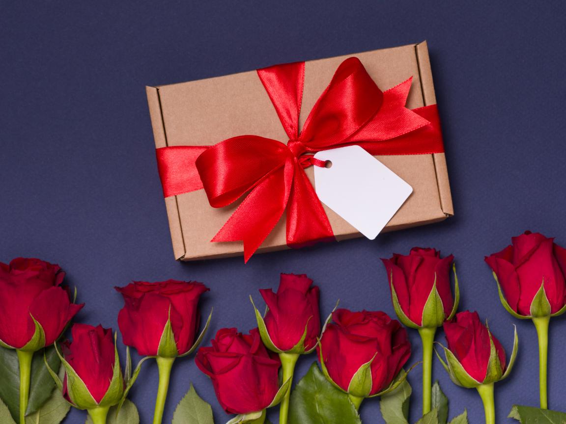 Wallpaper Gift with a red bow on a table with roses