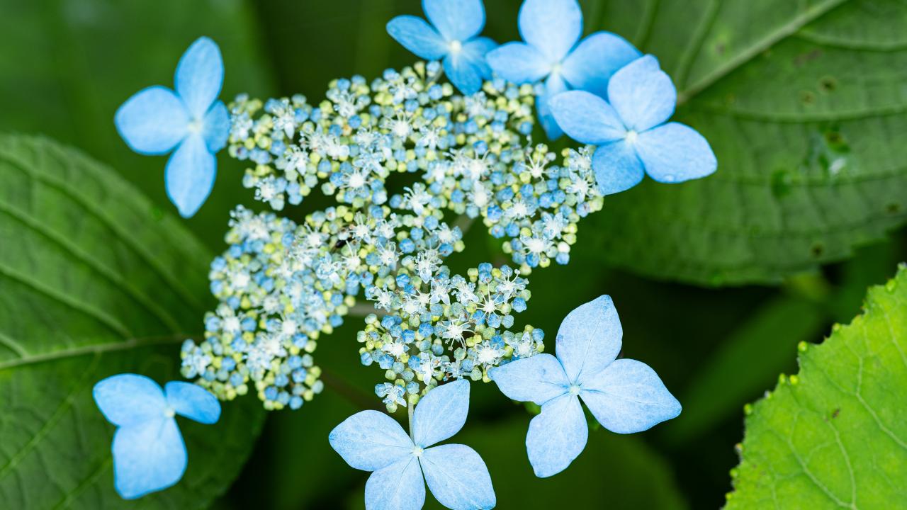 Wallpaper Blooming blue hydrangea flowers in green leaves