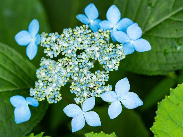 Wallpaper Blooming blue hydrangea flowers in green leaves