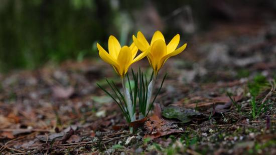 Wallpaper Two yellow crocus flowers on cold ground