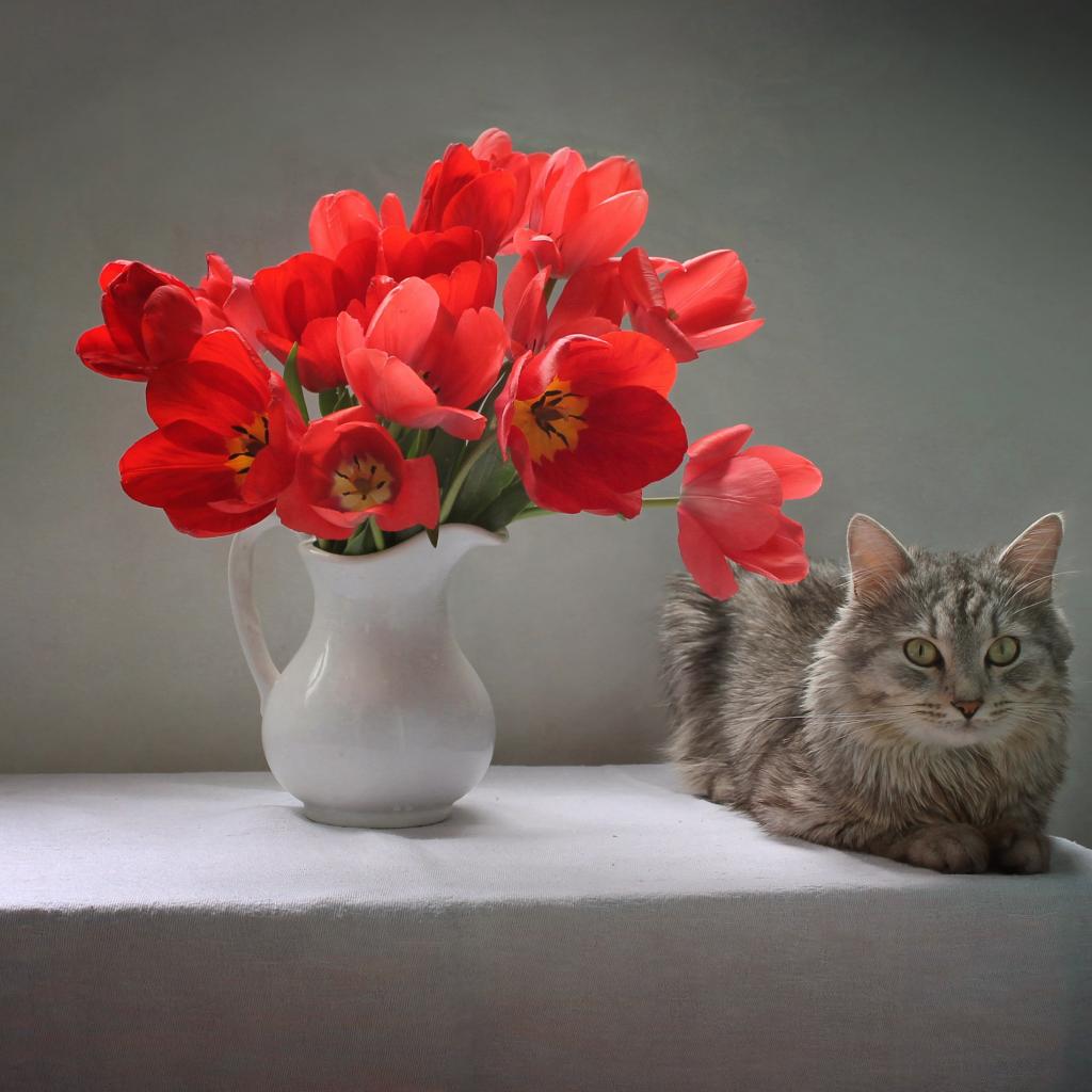 Wallpaper A bouquet of red tulips in a white vase on a table with a cat