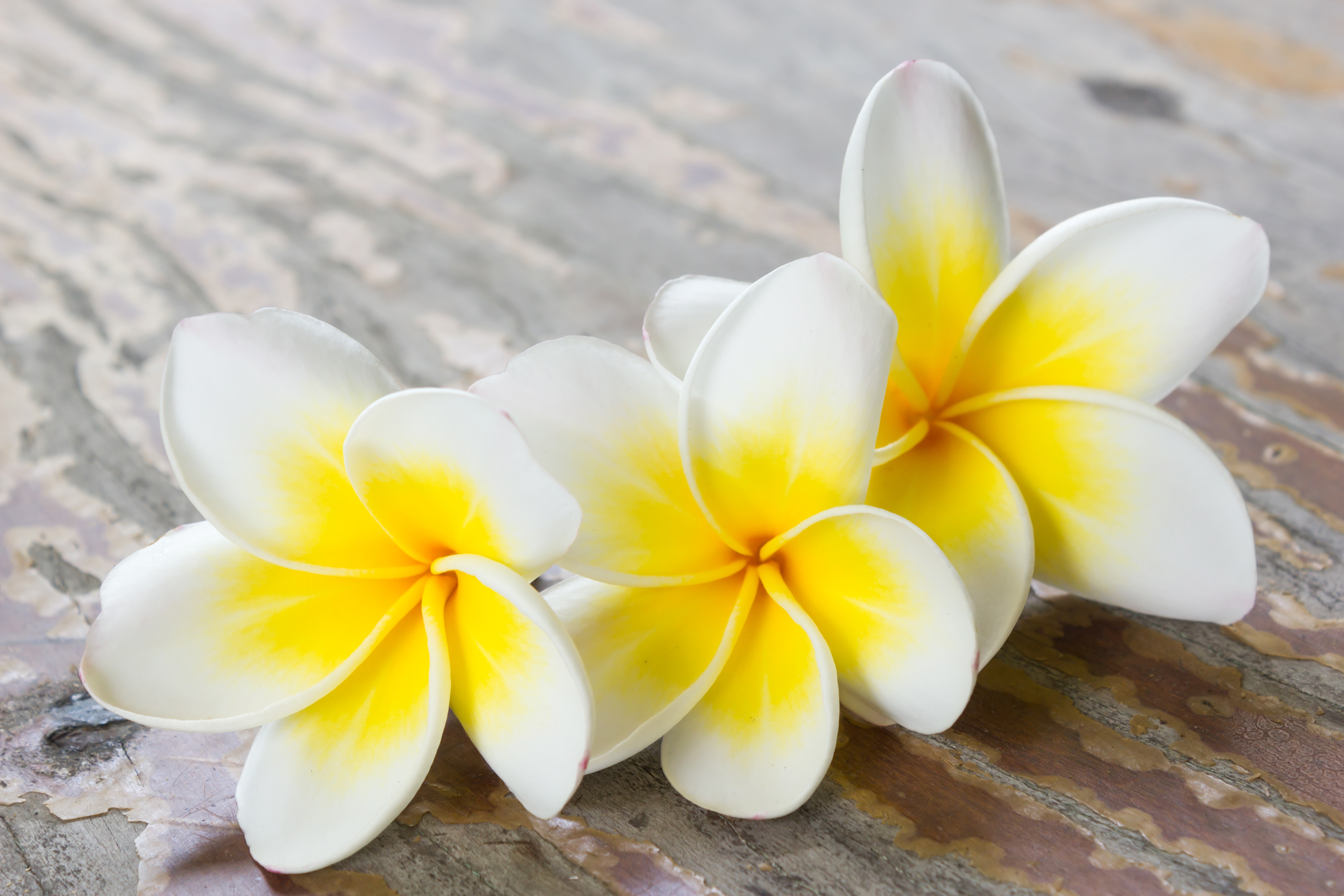 Wallpaper Three plumeria flowers on a wooden table