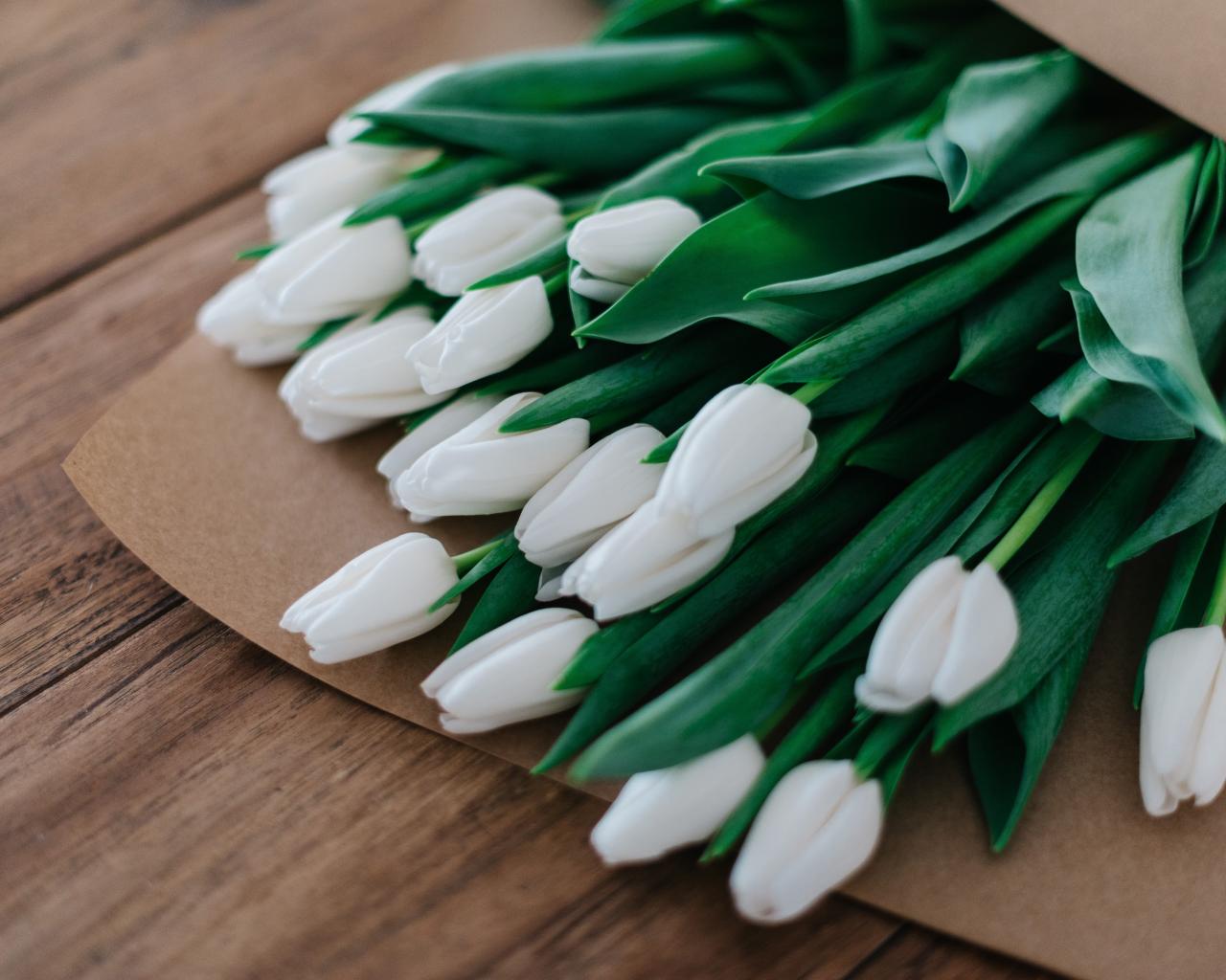 Wallpaper Large bouquet of white tulips in a paper bag