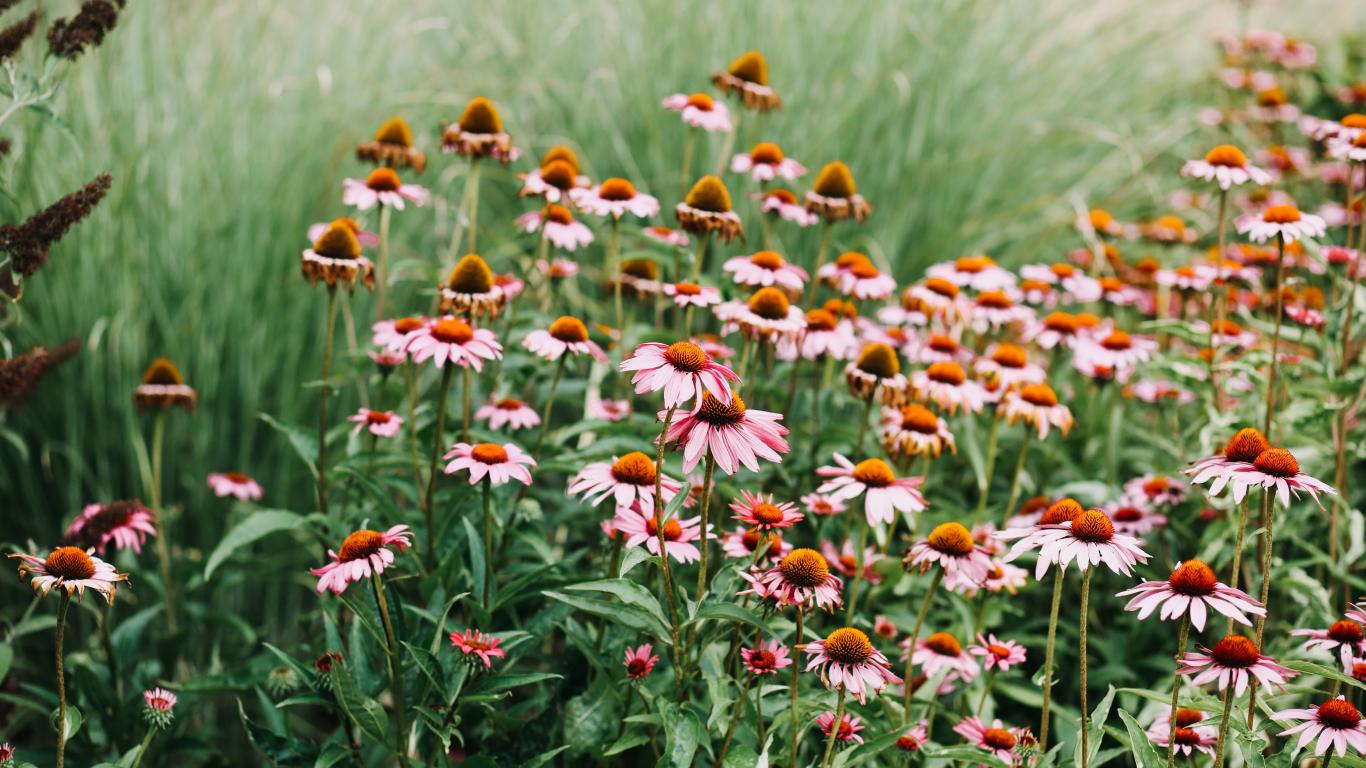 Wallpaper Pink Echinacea flowers close-up on a flower bed