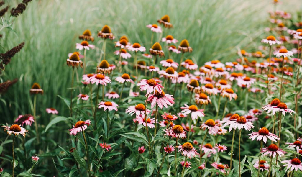 Wallpaper Pink Echinacea flowers close-up on a flower bed