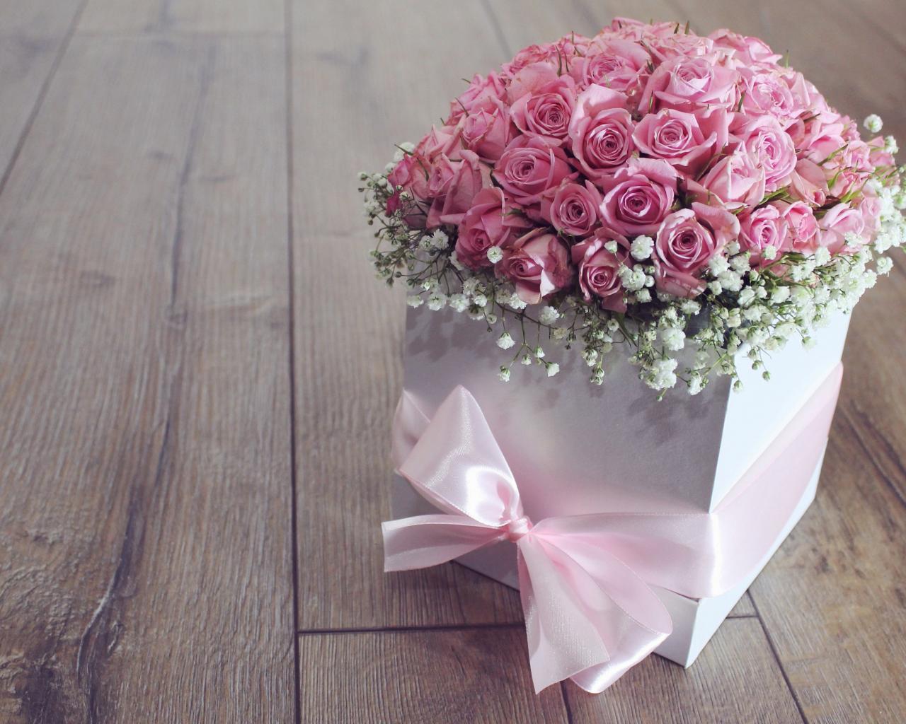 Wallpaper Gift box with a bouquet of pink roses and bow