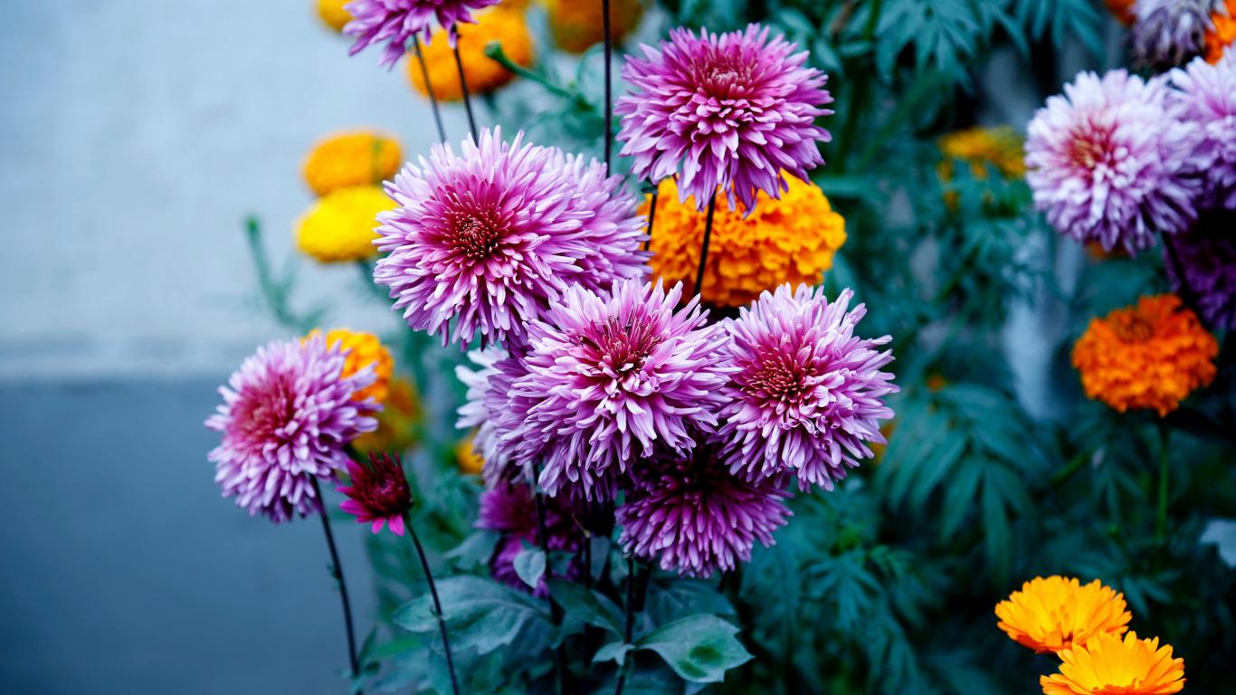 Wallpaper Pink dahlias with marigolds on a flower bed