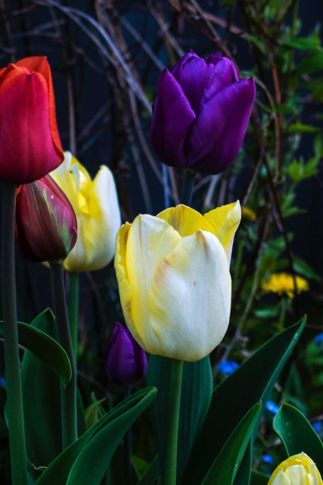 Wallpaper Multicolored tulips on a flower bed close up