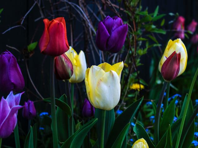 Wallpaper Multicolored tulips on a flower bed close up