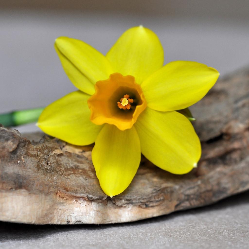 Wallpaper Yellow daffodil flower lies on the bark