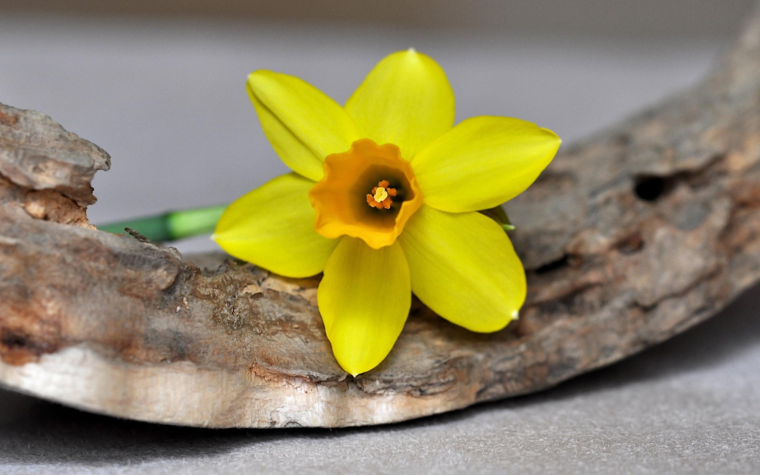Wallpaper Yellow daffodil flower lies on the bark