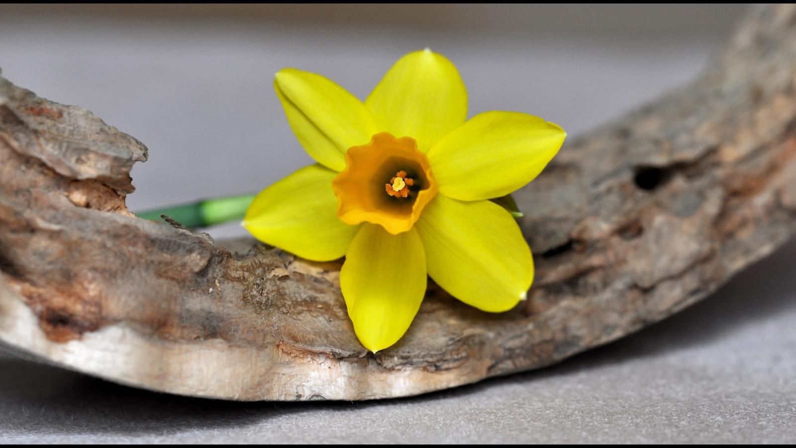 Wallpaper Yellow daffodil flower lies on the bark
