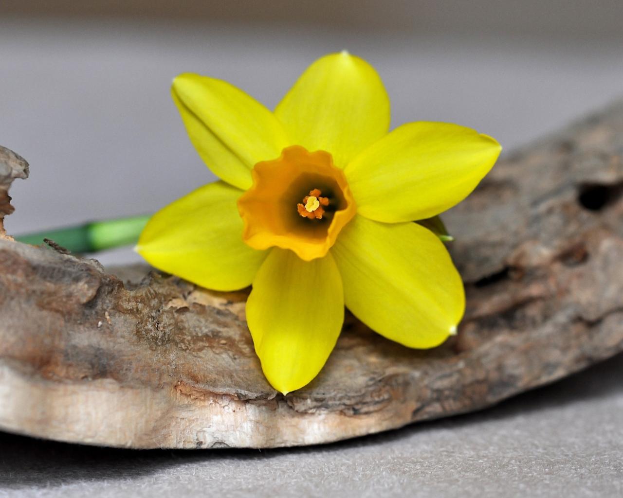 Wallpaper Yellow daffodil flower lies on the bark