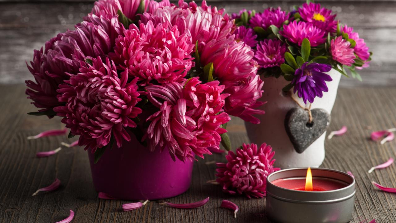 Wallpaper Two beautiful bouquets of aster flowers with a candle