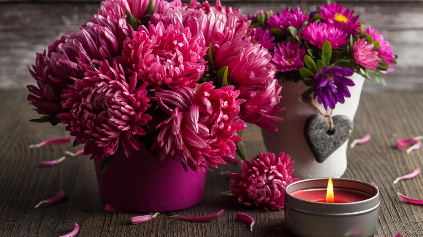 Wallpaper Two beautiful bouquets of aster flowers with a candle