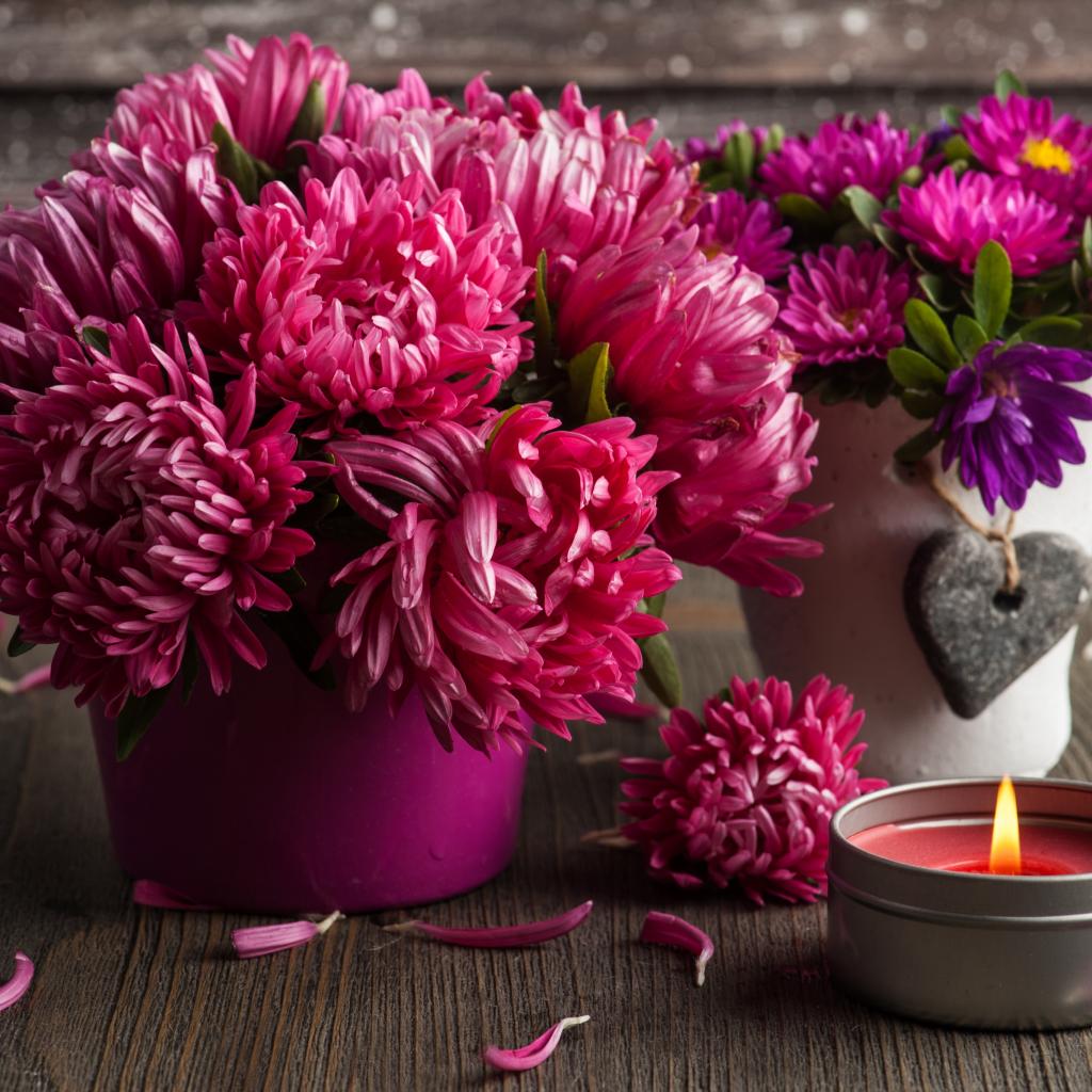Wallpaper Two beautiful bouquets of aster flowers with a candle