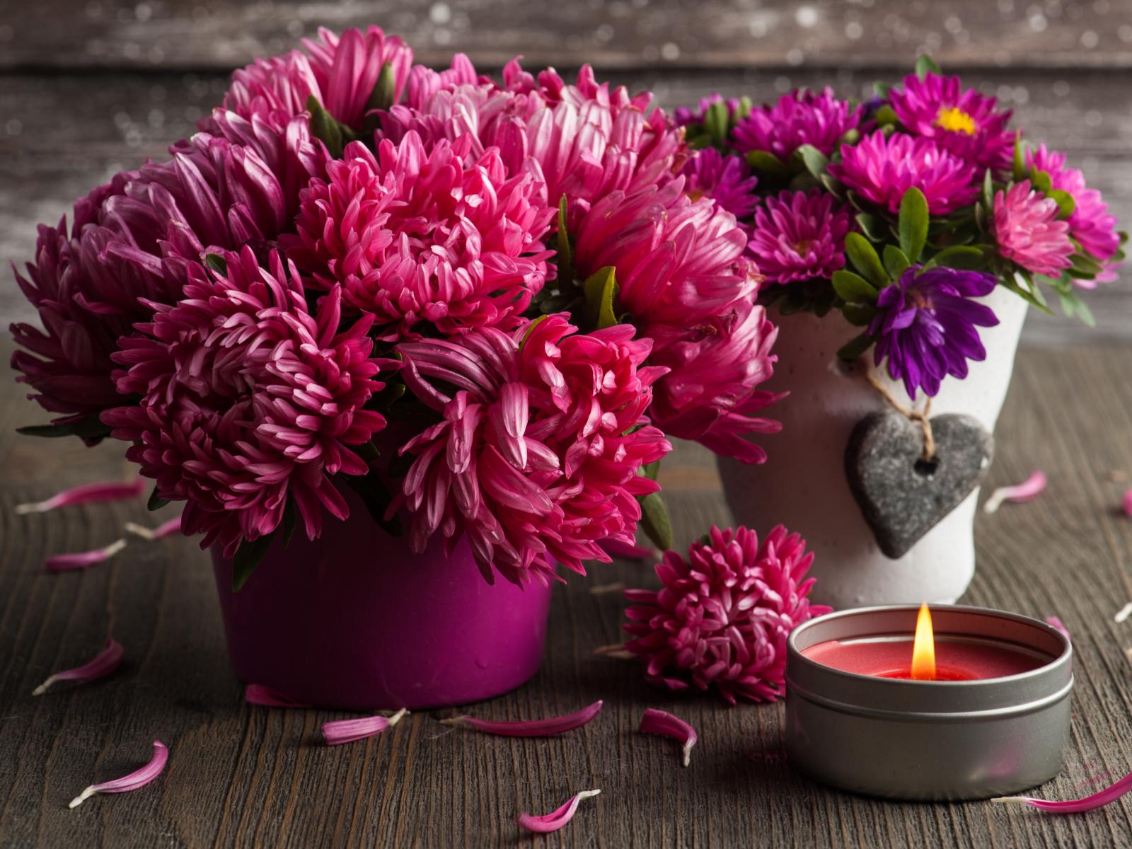 Wallpaper Two beautiful bouquets of aster flowers with a candle