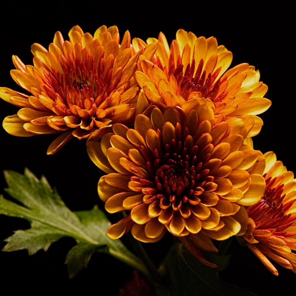 » Wallpaper Four orange chrysanthemum flowers on a black background