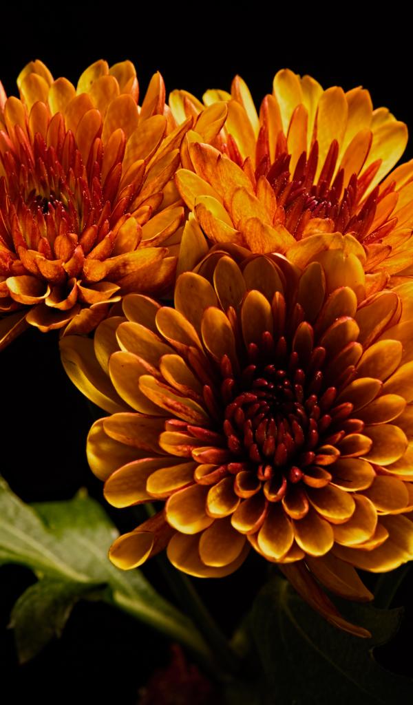 » Wallpaper Four orange chrysanthemum flowers on a black background