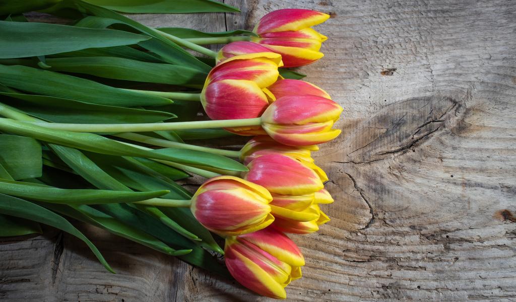 Wallpaper Bouquet of red tulips with yellow rims on a wooden table