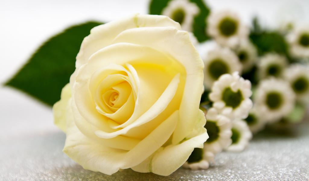 Wallpaper Delicate white rose lies on a table with daisies
