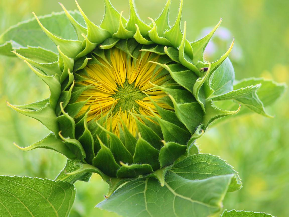 Wallpaper Sunflower in a field with blue flowers against the sky
