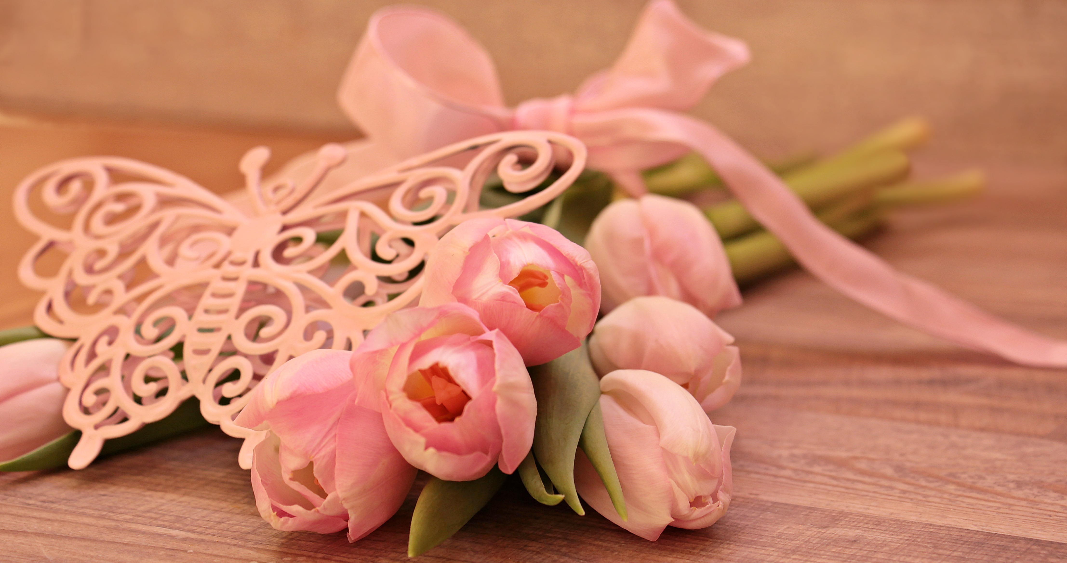 Wallpaper Bouquet of pink tulips with ribbon and butterfly