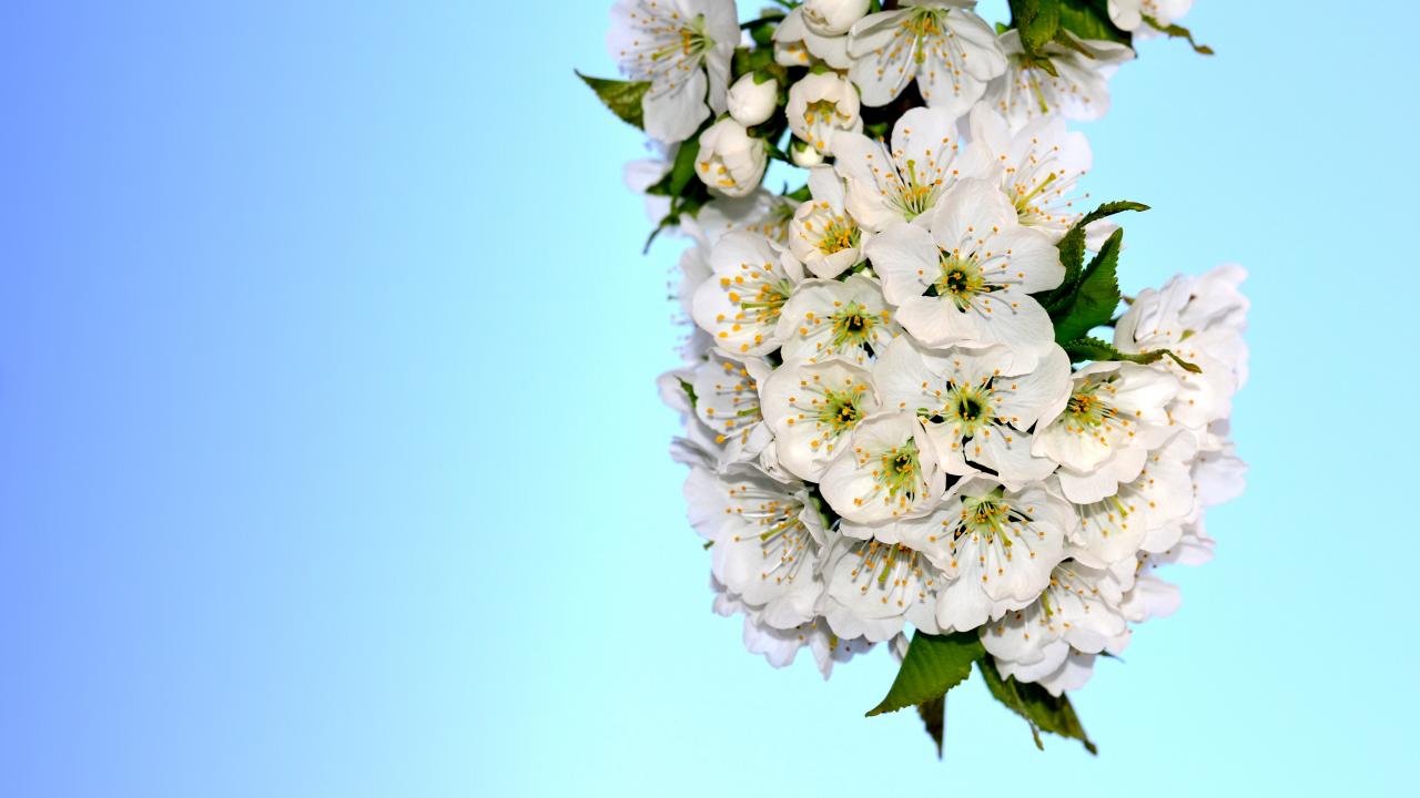 Wallpaper White cherry flowers with green leaves on a blue background