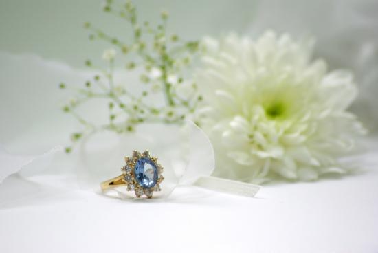 Wallpaper Expensive ring with a stone on a table with a white flower