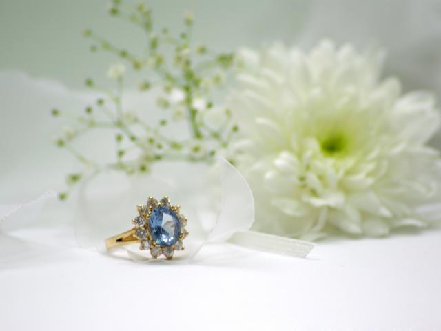 Wallpaper Expensive ring with a stone on a table with a white flower