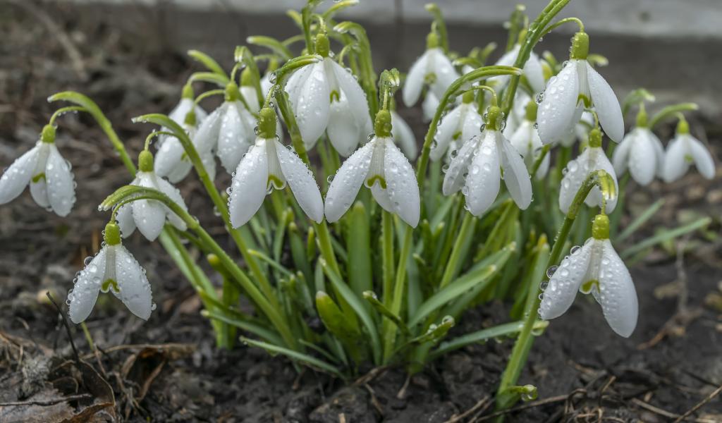 Wallpaper Bush of white snowdrops in raindrops