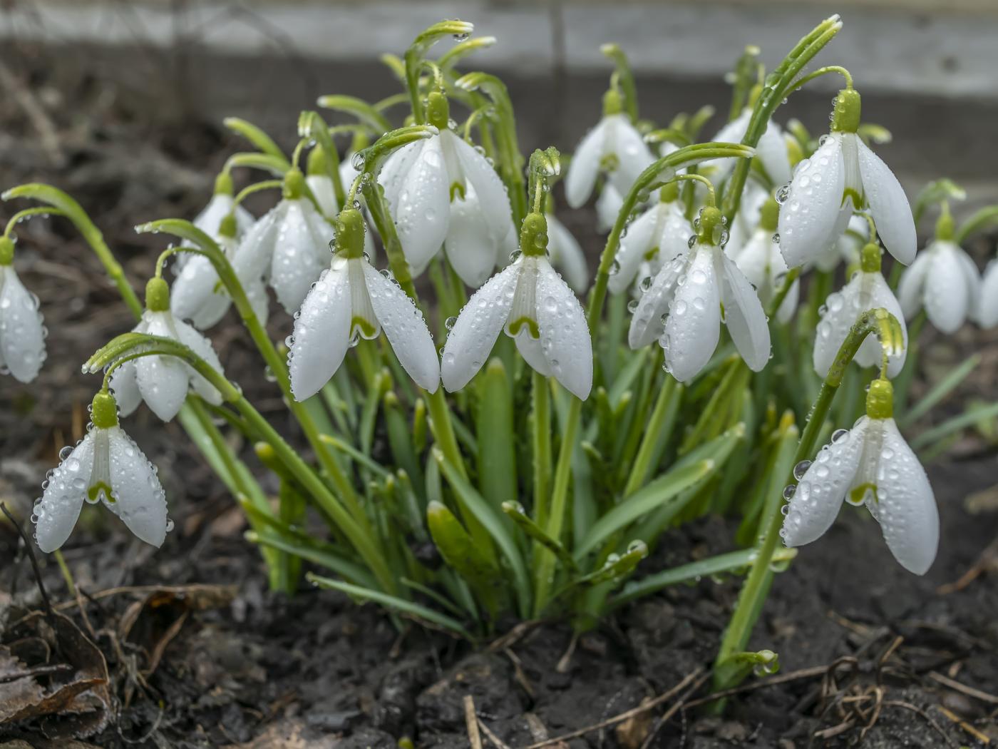 Wallpaper Bush of white snowdrops in raindrops