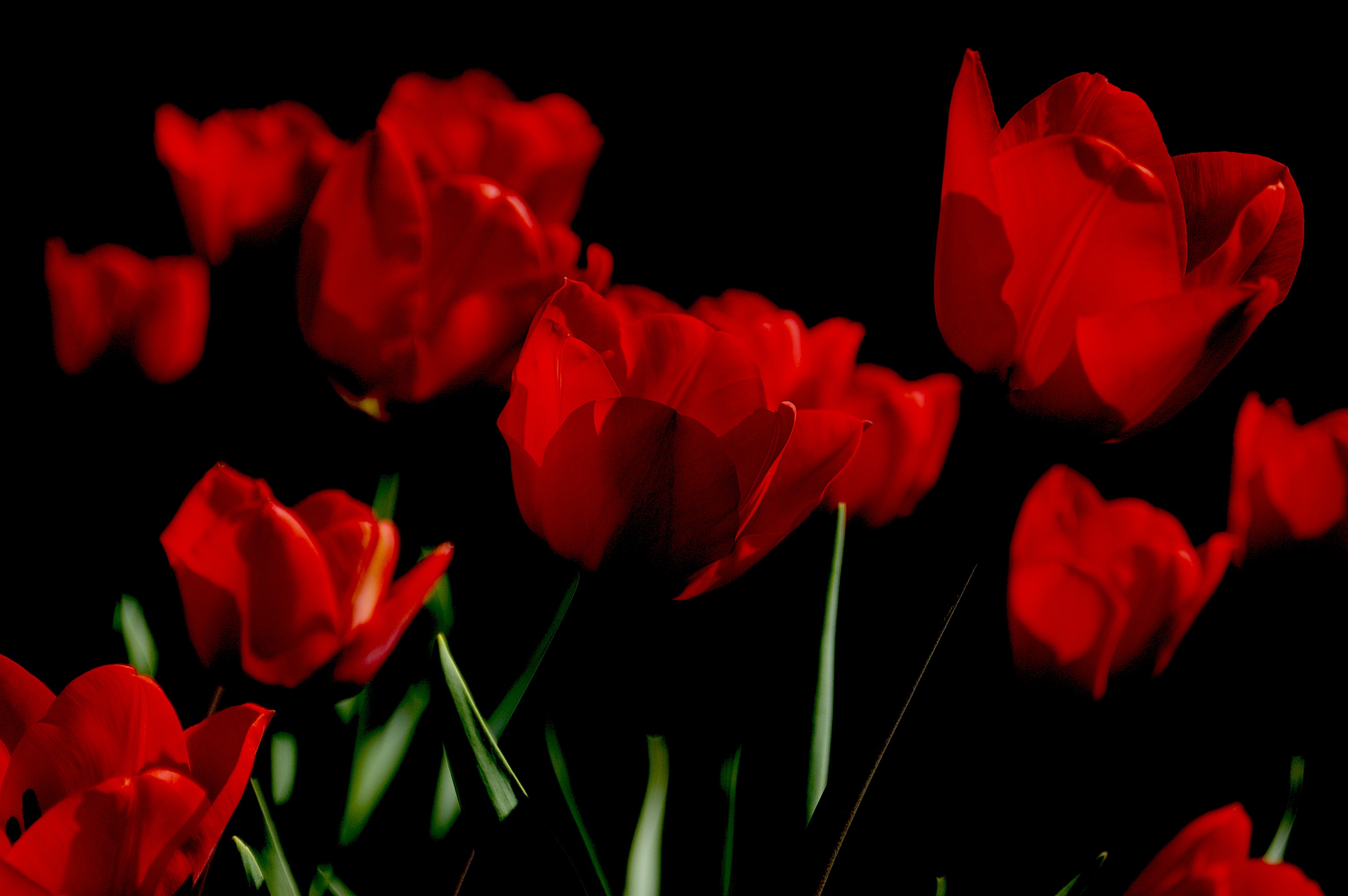 Wallpaper Bright scarlet spring tulips on a black background