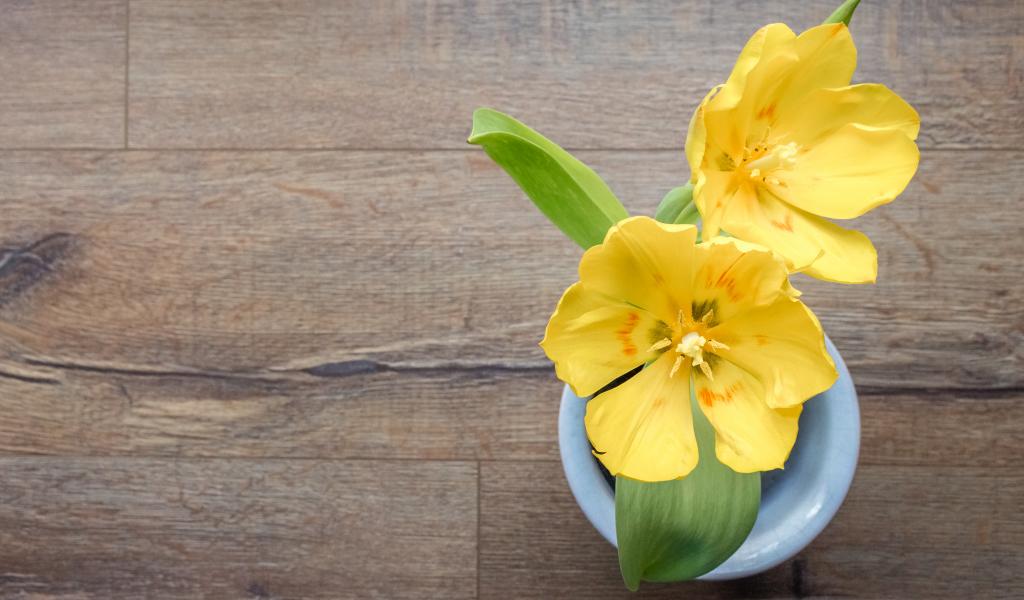 Wallpaper Two yellow tulip flowers on the table in a vase