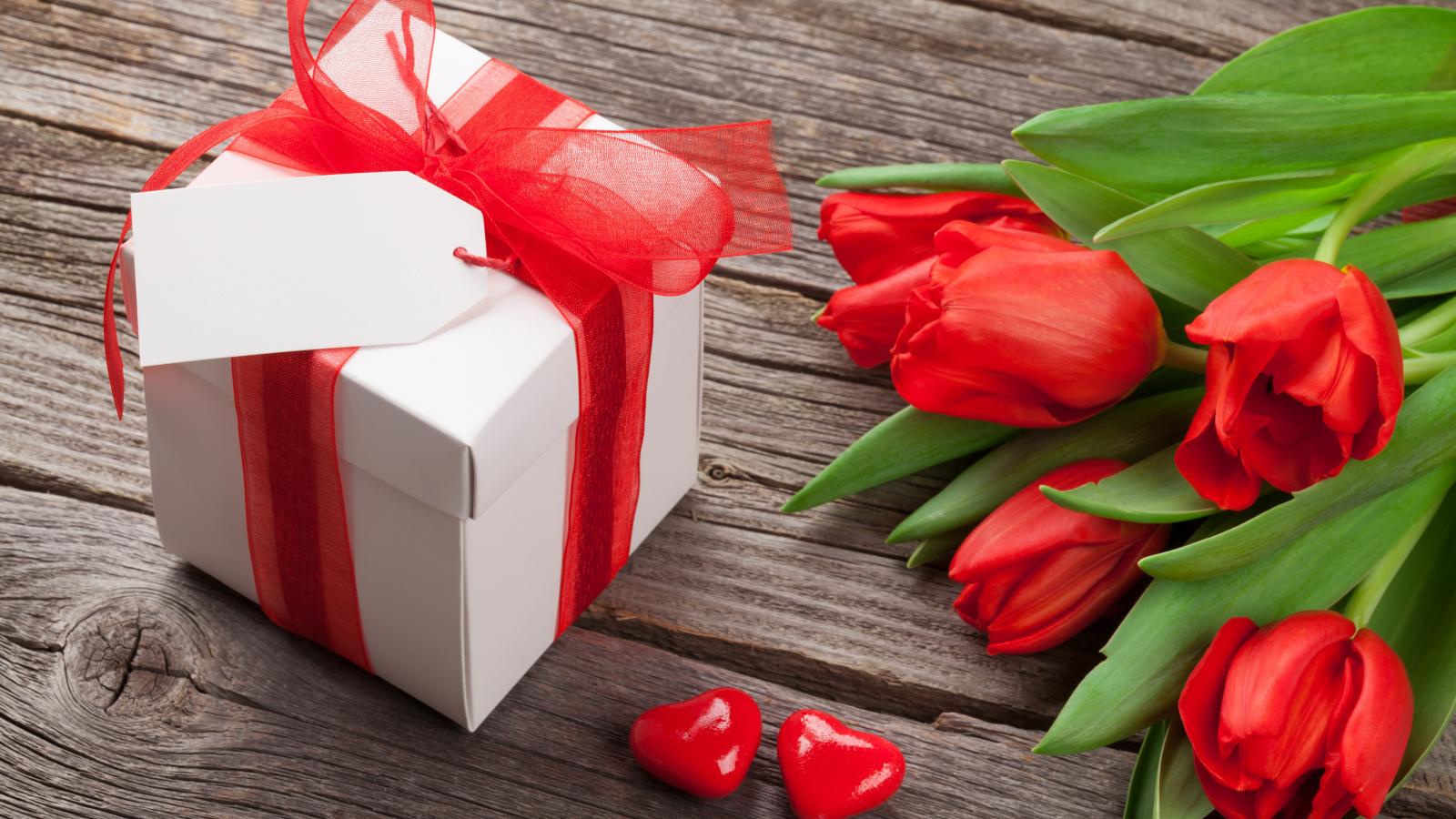 Wallpaper Red tulips with a big gift on a wooden table