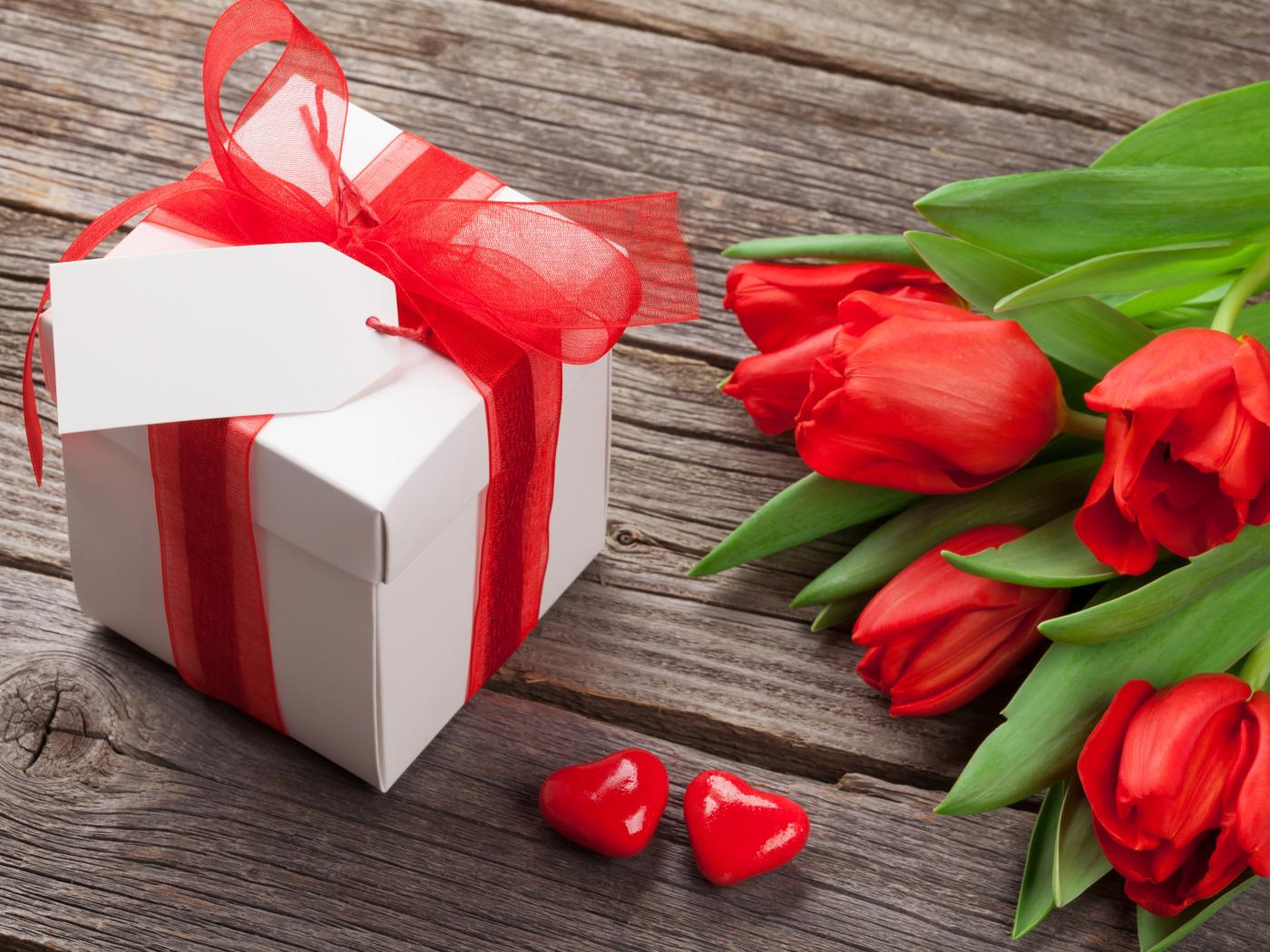 Wallpaper Red tulips with a big gift on a wooden table