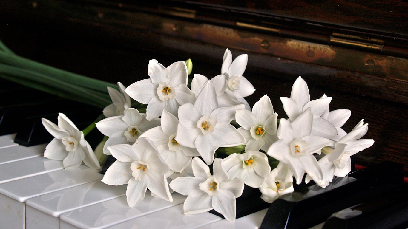 Wallpaper Bouquet of white daffodils on the piano keys