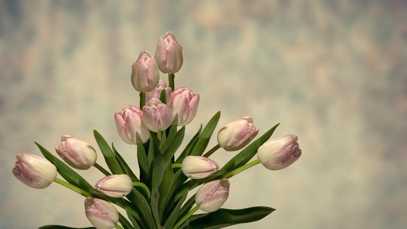 Wallpaper Bouquet of pink tulips with green leaves on a gray background