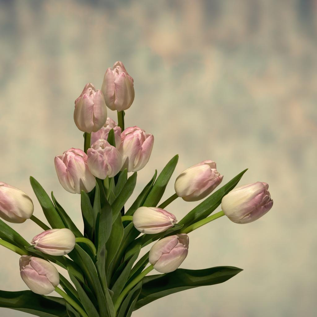 Wallpaper Bouquet of pink tulips with green leaves on a gray background