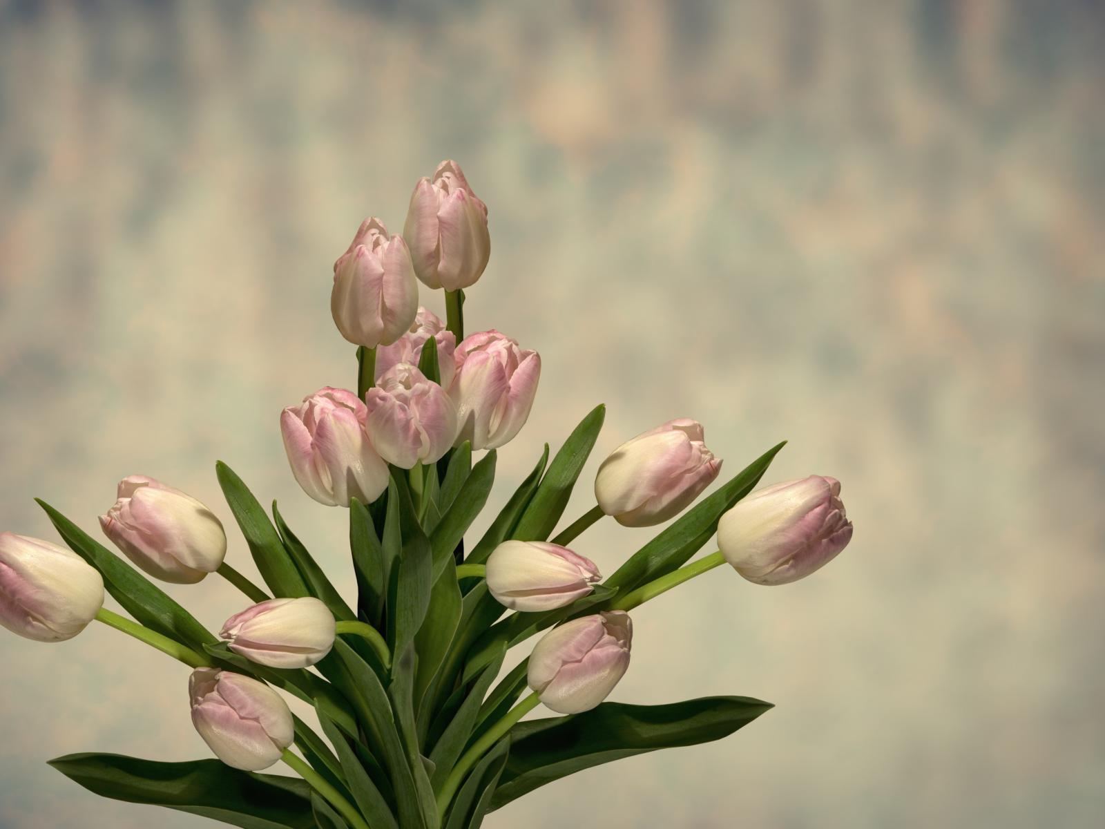 Wallpaper Bouquet of pink tulips with green leaves on a gray background