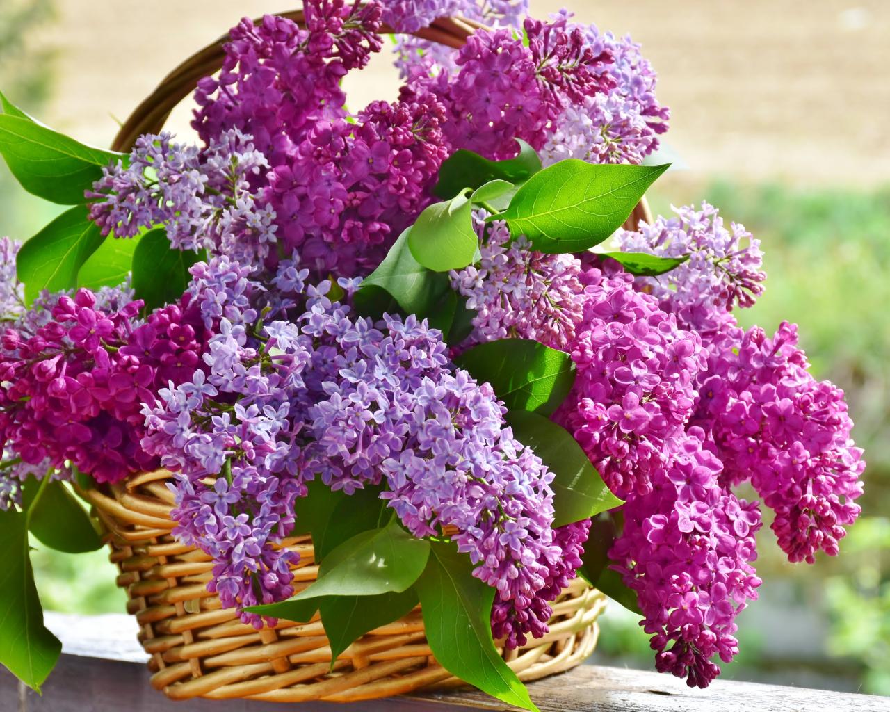 Wallpaper Bouquet of lilacs in a wicker basket on a bench in spring