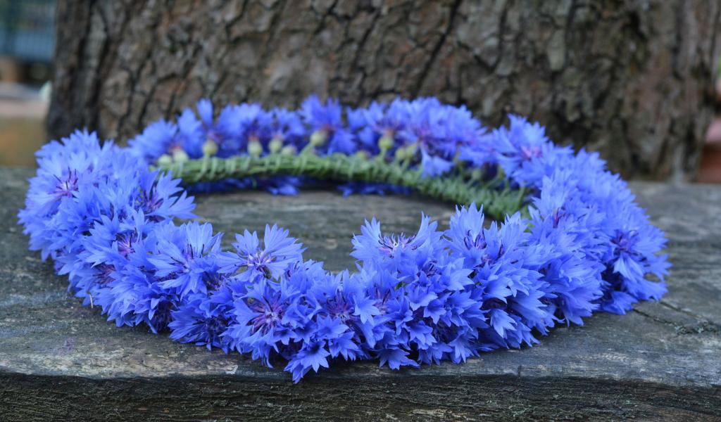 Wallpaper A wreath of blue flowers cornflower on a bench