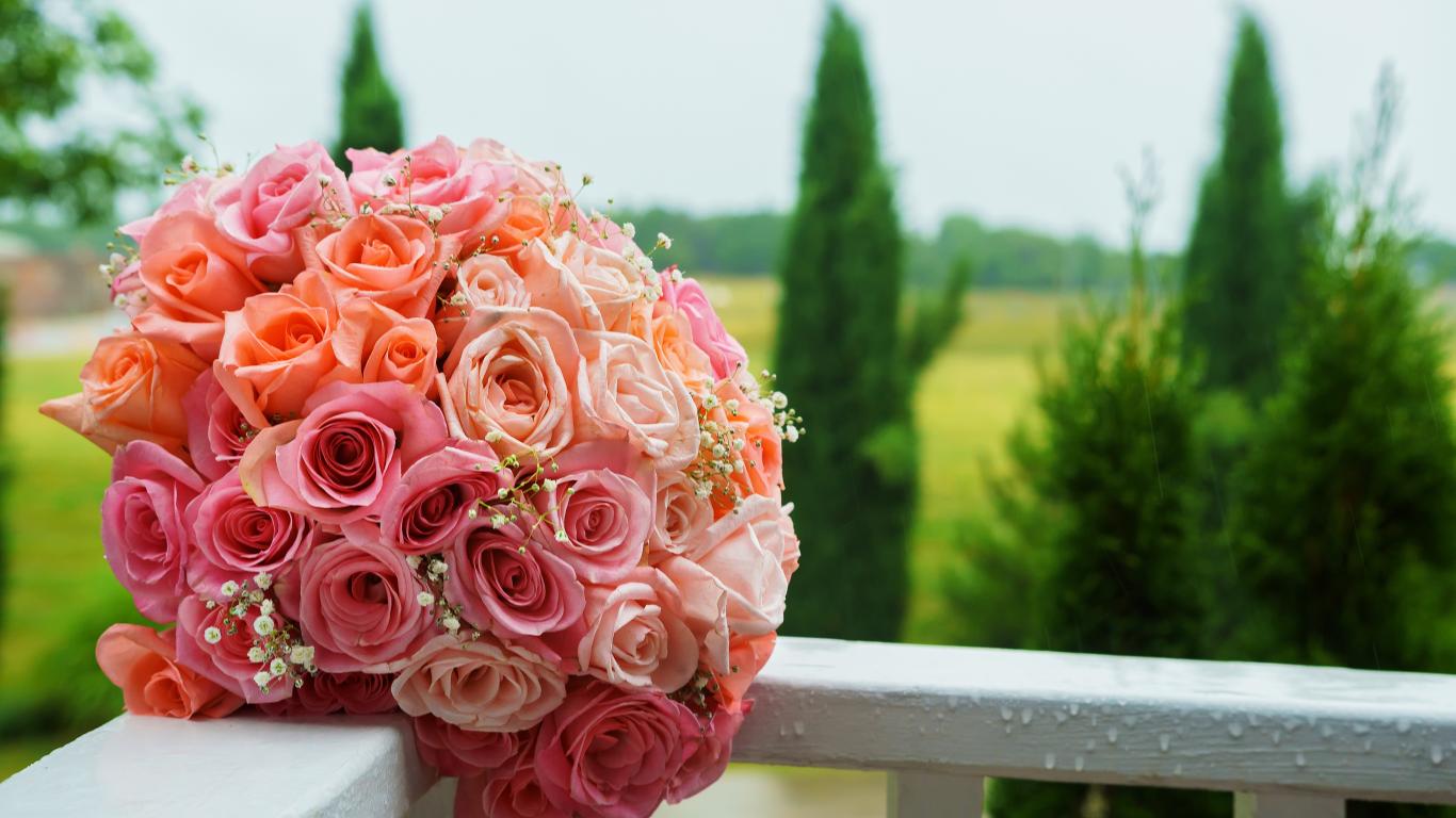 Wallpaper Beautiful wedding bouquet of pink roses on white railing