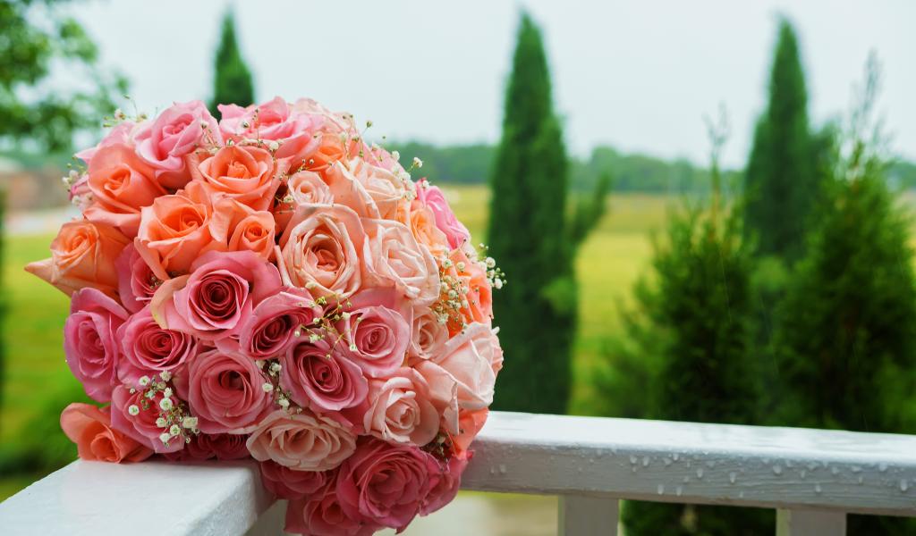Wallpaper Beautiful wedding bouquet of pink roses on white railing