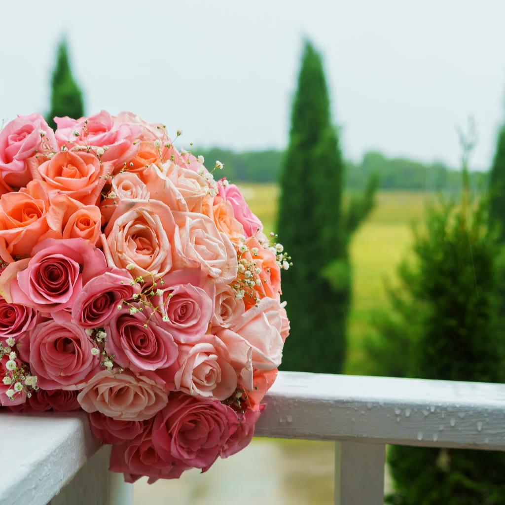 Wallpaper Beautiful wedding bouquet of pink roses on white railing