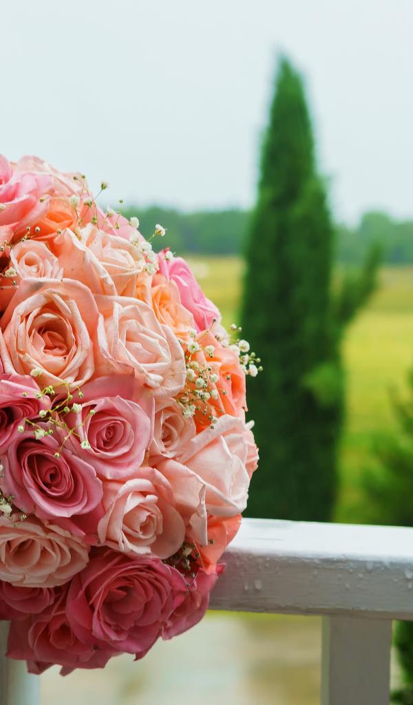 Wallpaper Beautiful wedding bouquet of pink roses on white railing